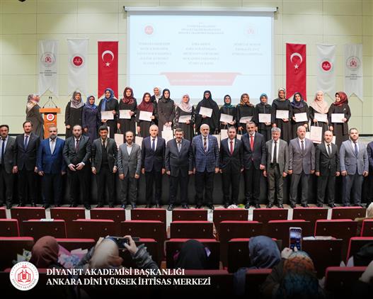 Merkezimizde, 2. Dönem Kıraat/Aşere Kadın Kursiyerleri Mezuniyet Merasimi düzenlendi. Programa; Diyanet İşleri Başkan Yardımcısı Dr. Hafiz Osman Şahin, İdari ve Mali İşler Daire Başkanı Turgut Tunç, İzleme ve Değerlendirme Daire Başkanı Dr. Kerim Şükrü Ünlü, Hafızlık Eğitimi Daire Başkanı İbrahim Yılmaz, Ankara İl Müftü Yardımcısı Yusuf Dikmen ile Mushafları İnceleme ve Kıraat Kurulu üyeleri katıldı.